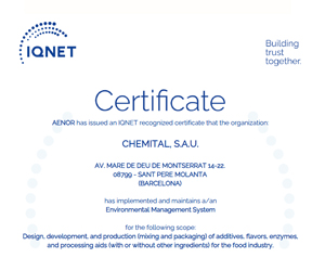 Diseño, desarrollo y elaboración (mezclado y envasado) de aditivos, aromas, enzimas y coadyuvantes (con y sin otros ingredientes) para la industria alimentaria.IQNET